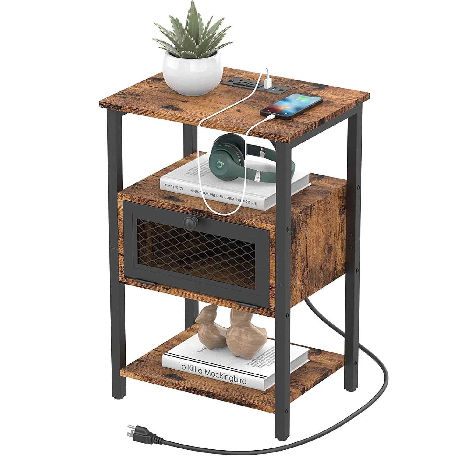 Side Tables with Charging Station and Drawer Set of 2 Night Stands with USB Ports 3 Tier Narrow Bedside Table
